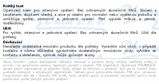 Opalovací krém pro intenzivní opálení. Bez ochranných slunečních filtrů. Složení s karotenem, slupkami ořechů a aloe je ideální pro normální nebo opálenou pokožku a umožňuje rychlé, intenzivní a jednotné opálení. Pleť vypadá měkce a jemně. Voděodolný.