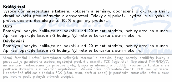 Vysoce účinná receptura s kakaem, kokosem a semínky, obohacená o okurku a kmín, chrání pokožku před stárnutím a dehydratací. Tělový olej pokožku hydratuje a urychluje proces opálení. Bez alergenů. 100% organický produkt.