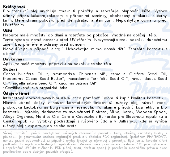 Bio-intenzivní olej urychluje tmavnutí pokožky a zabraňuje olupování kůže. Vysoce účinný přípr.s kakaem,kokosem a přírodními semínky, obohacený o okurku a černý kmín, které chrání pokožku před dehydratací a stárnutím. Neposkytuje ochranu před UV zářením.
