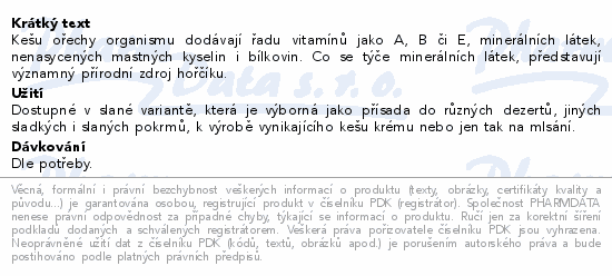 Kešu ořechy organismu dodávají řadu vitamínů jako A, B či E, minerálních látek, nenasycených mastných kyselin i bílkovin. Co se týče minerálních látek, představují významný přírodní zdroj hořčíku.