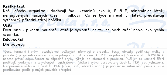 Kešu ořechy organismu dodávají řadu vitamínů jako A, B či E, minerálních látek, nenasycených mastných kyselin i bílkovin. Co se týče minerálních látek, představují významný přírodní zdroj hořčíku.