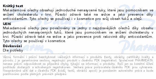 Makadamové ořechy obsahují jednoduché nenasycené tuky, které jsou pomocníkem ve snížení cholesterolu v krvi. Působí zdravě také na srdce a jako prevence díky antioxidantům. Tyto ořechy se používají i v kosmetice pro svůj obsah tuků a olejů.