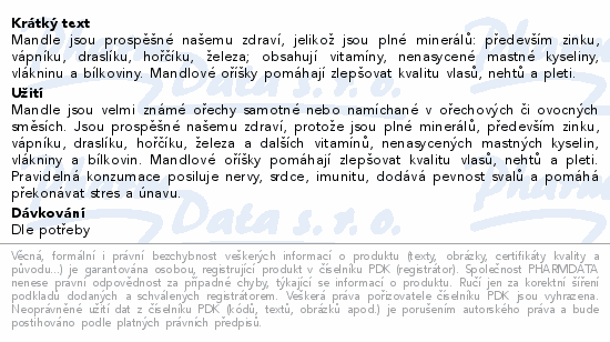 Mandle jsou prospěšné našemu zdraví, jelikož jsou plné minerálů: především zinku, vápníku, draslíku, hořčíku, železa; obsahují vitamíny, nenasycené mastné kyseliny, vlákninu a bílkoviny. Mandlové oříšky pomáhají zlepšovat kvalitu vlasů, nehtů a pleti.