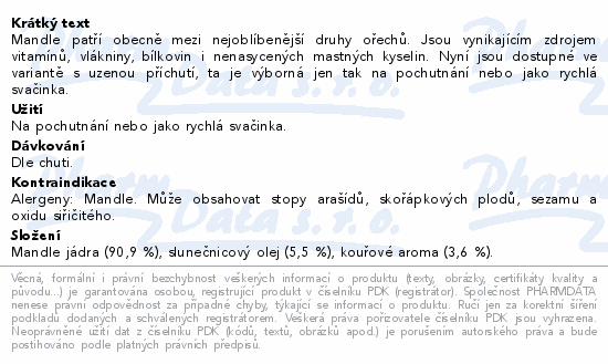 Mandle patří obecně mezi nejoblíbenější druhy ořechů. Jsou vynikajícím zdrojem vitamínů, vlákniny, bílkovin i nenasycených mastných kyselin. Nyní jsou dostupné ve variantě s uzenou příchutí, ta je výborná jen tak na pochutnání nebo jako rychlá svačinka.