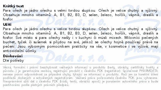 Para ořech je jádro ořechu s velmi tvrdou slupkou. Ořech je velice chutný a výživný. Obsahuje mnoho vitamínů: A, B1, B2, B3, D, selen, železo, hořčík, vápník, draslík a fosfor.
