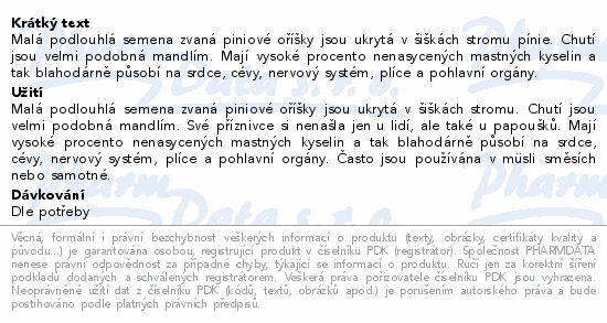 Malá podlouhlá semena zvaná piniové oříšky jsou ukrytá v šiškách stromu pínie. Chutí jsou velmi podobná mandlím. Mají vysoké procento nenasycených mastných kyselin a tak blahodárně působí na srdce, cévy, nervový systém, plíce a pohlavní orgány.