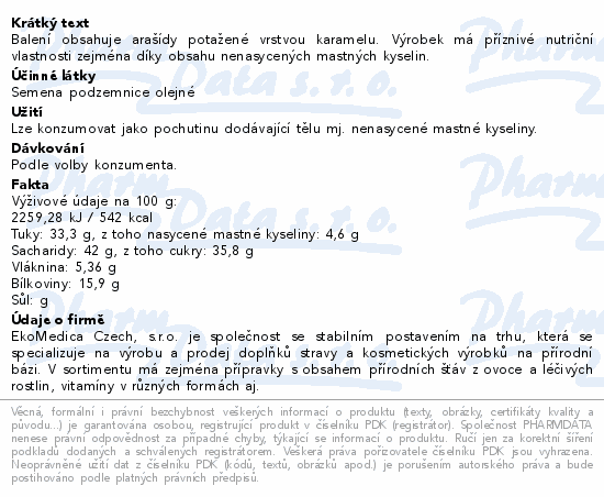 Balení obsahuje arašídy potažené vrstvou karamelu. Výrobek má příznivé nutriční vlastnosti zejména díky obsahu nenasycených mastných kyselin.