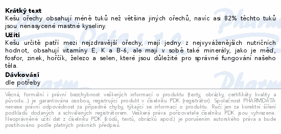Kešu ořechy obsahují méně tuků než většina jiných ořechů, navíc asi 82% těchto tuků jsou nenasycené mastné kyseliny.