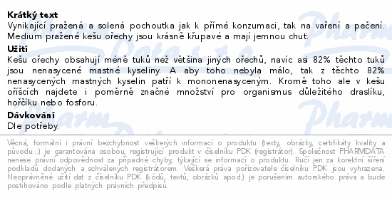 Vynikající pražená a solená pochoutka jak k přímé konzumaci, tak na vaření a pečení. Medium pražené kešu ořechy jsou krásně křupavé a mají jemnou chuť.