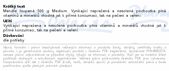 Mandle loupané 500 g Medium. Vynikající nepražená a nesolená pochoutka plná vitamínů a minerálů vhodná jak k přímé konzumaci, tak na pečení a vaření.