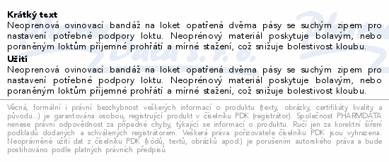 Neoprenová ovinovací bandáž na loket opatřená dvěma pásy se suchým zipem pro nastavení potřebné podpory loktu. Neoprénový materiál poskytuje bolavým, nebo poraněným loktům příjemné prohřátí a mírné stažení, což snižuje bolestivost kloubu.