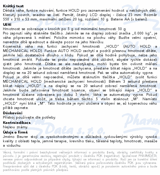 Dětská váha, funkce nulování, funkce HOLD pro zaznamenání hodnot u neklidných dětí. Klenutý povrch, snadno se čistí. Paměť, čitelný LCD displej - číslice 23 mm. Rozměr 550 x 310 x 53 mm, maximální zatížení 20 kg, rozlišení 10 g. Baterie AA (v balení).