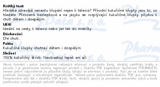 Hledáte zdravější variantu křupání nejen k televizi? Přírodní kukuřičné křupky jsou to, co hledáte. Přirozeně bezlepkové a na jazyku se rozplývající kukuřičné křupky přijdou k chuti dětem i dospělým.