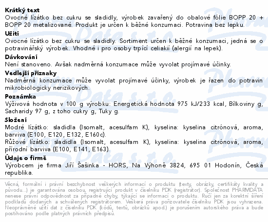 Ovocné lízátko bez cukru se sladidly, výrobek zavařený do obalové fólie BOPP 20 + BOPP 20 metalizované. Produkt je určen k běžné konzumaci. Potravina bez lepku.