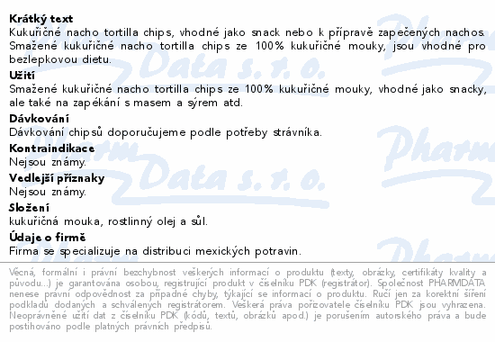Kukuřičné nacho tortilla chips, vhodné jako snack nebo k přípravě zapečených nachos. Smažené kukuřičné nacho tortilla chips ze 100% kukuřičné mouky, jsou vhodné pro bezlepkovou dietu.