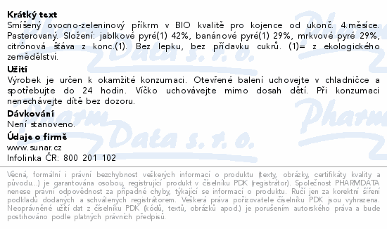Smíšený ovocno-zeleninový příkrm v BIO kvalitě pro kojence od ukonč. 4.měsíce. Pasterovaný. Složení: jablkové pyré(1) 42%, banánové pyré(1) 29%, mrkvové pyré 29%, citrónová šťáva z konc.(1). Bez lepku, bez přídavku cukrů. (1)= z ekologického zemědělství.