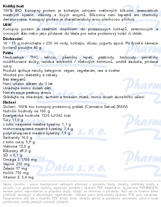 100% BIO Konopný protein je bohatým zdrojem rostlinných bílkovin, esenciálních mastných kyselin, vlákniny a živých enzymů. Bílkovina není tepelně ani chemicky denaturována. Konopný protein je charakteristický svou ořechovou příchutí.