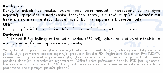 Kontryhel neboli husí nožka, rosička nebo polní muškát – nenápadná bylinka bývá nejčastěji spojována s udržováním ženského zdraví, ale také přispívá k normálnímu trávení, a normálnímu stavu kloubů i svalů. Bylinka napomáhá k osvěžení těla.