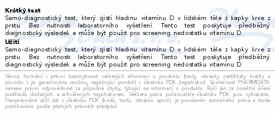 Samo-diagnostický test, který zjistí hladinu vitamínu D v lidském těle z kapky krve z prstu. Bez nutnosti laboratorního vyšetření. Tento test poskytuje předběžný diagnostický výsledek a může být použit pro screening nedostatku vitamínu D.
