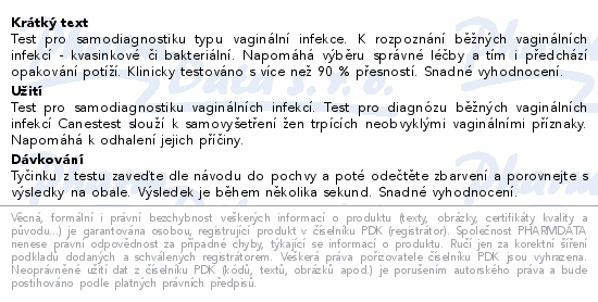 Test pro samodiagnostiku typu vaginální infekce. K rozpoznání běžných vaginálních infekcí - kvasinkové či bakteriální. Napomáhá výběru správné léčby a tím i předchází opakování potíží. Klinicky testováno s více než 90% přesností. Snadné vyhodnocení.