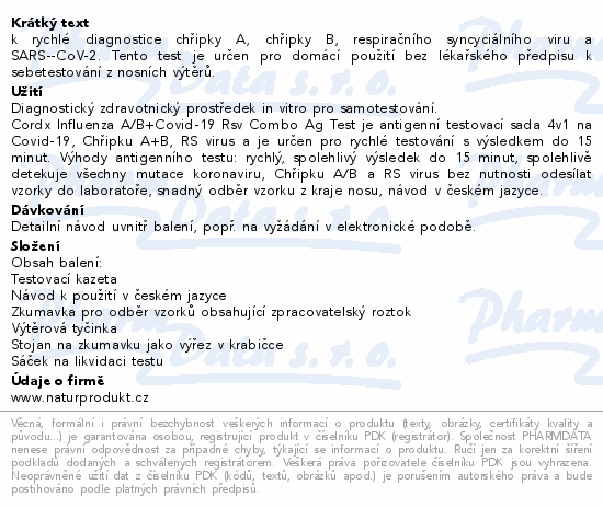 k rychlé diagnostice chřipky A, chřipky B, respiračního syncyciálního viru a SARS--CoV-2. Tento test je určen pro domácí použití bez lékařského předpisu k sebetestování z nosních výtěrů.