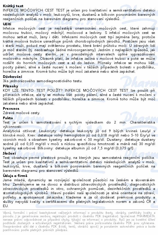 INFEKCE MOČOVÝCH CEST TEST je určen pro kvalitativní a semikvantitativní detekci následujících analytů v moči: leukocytů, krve, dusitanů a bílkovin porovnáním barevných reagenčních políček na barevném diagramu pro stanovení výsledků.