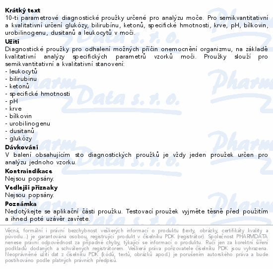 10-ti parametrové diagnostické proužky určené pro analýzu moče. Pro semikvantitativní a kvalitativní určení glukózy, bilirubínu, ketonů, specifické hmotnosti, krve, pH, bílkovin, urobilinogenu, dusitanů a leukocytů v moči.
