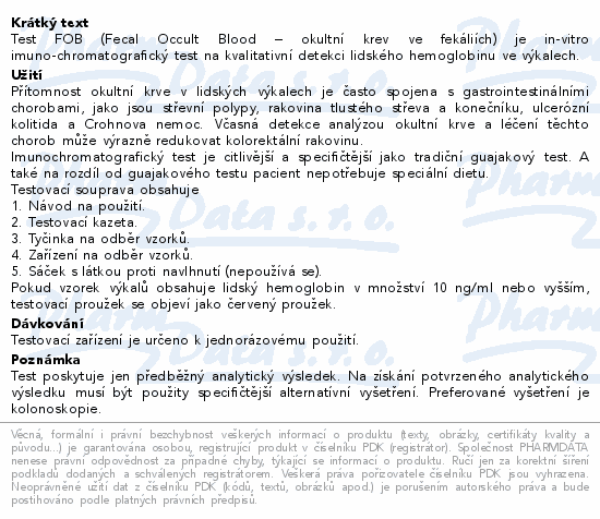 Test FOB (Fecal Occult Blood – okultní krev ve fekáliích) je in-vitro imuno-chromatografický test na kvalitativní detekci lidského hemoglobinu ve výkalech.