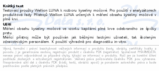 Testovací proužky Wellion LUNA k rozboru kyseliny močové. Pro použití v analyzátorech produktové řady Přístrojů Wellion LUNA určených k měření obsahu kyseliny močové v plné krvi.