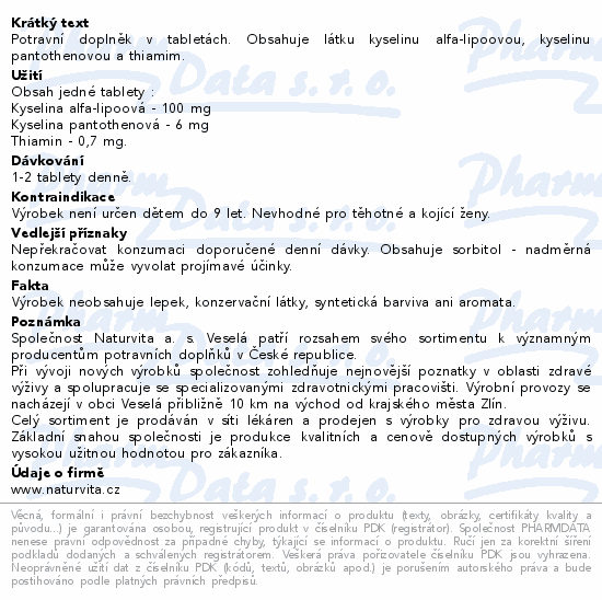 Potravní doplněk v tabletách. Obsahuje látku kyselinu alfa-lipoovou, kyselinu pantothenovou a thiamim.