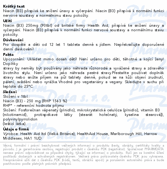 Niacin (B3) přispívá ke snížení únavy a vyčerpání. Niacin (B3) přispívá k normální funkci nervové soustavy a normálnímu stavu pokožky.