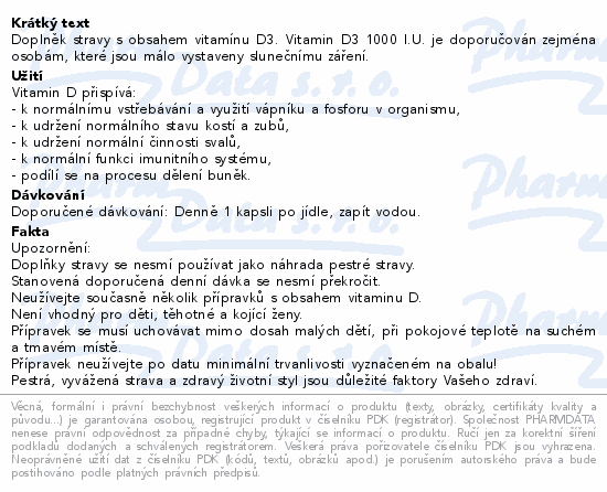 Doplněk stravy s obsahem vitamínu D3. Vitamin D3 1000 I.U. je doporučován zejména osobám, které jsou málo vystaveny slunečnímu záření.