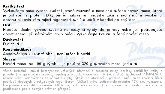 Vyzkoušejte naše vysoce kvalitní jemně zauzené a nasolené sušené hovězí maso, které je bohaté na protein. Díky téměř nulovému množství tuku a sacharidů a vysokému obsahu bílkovin vám zajistí regeneraci svalů a udrží v kondici po celý den.