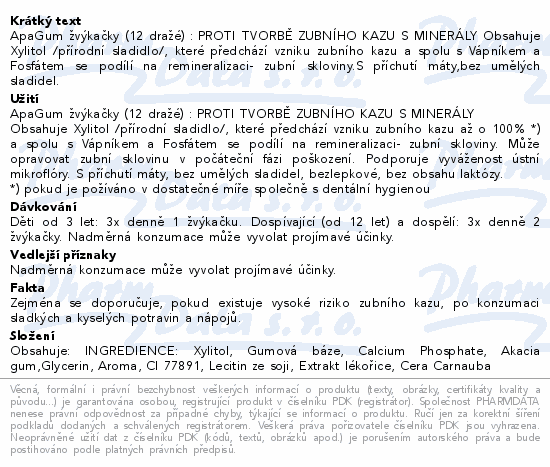 ApaGum žvýkačky (12 dražé) : PROTI TVORBĚ ZUBNÍHO KAZU S MINERÁLY Obsahuje Xylitol /přírodní sladidlo/, které předchází vzniku zubního kazu a spolu s Vápníkem a Fosfátem se podílí na remineralizaci- zubní skloviny.S příchutí máty,bez umělých sladidel.