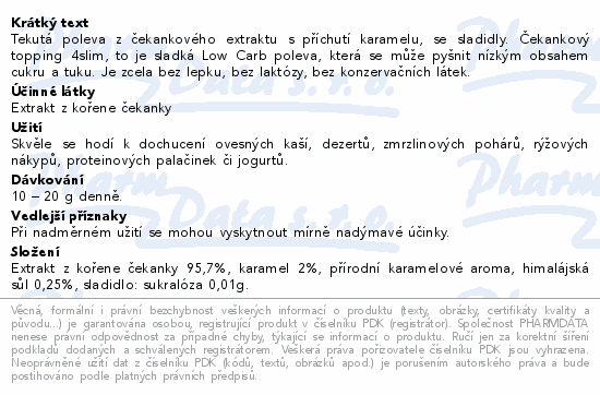 Tekutá poleva z čekankového extraktu s příchutí karamelu, se sladidly. Čekankový topping 4slim, to je sladká Low Carb poleva, která se může pyšnit nízkým obsahem cukru a tuku. Je zcela bez lepku, bez laktózy, bez konzervačních látek.