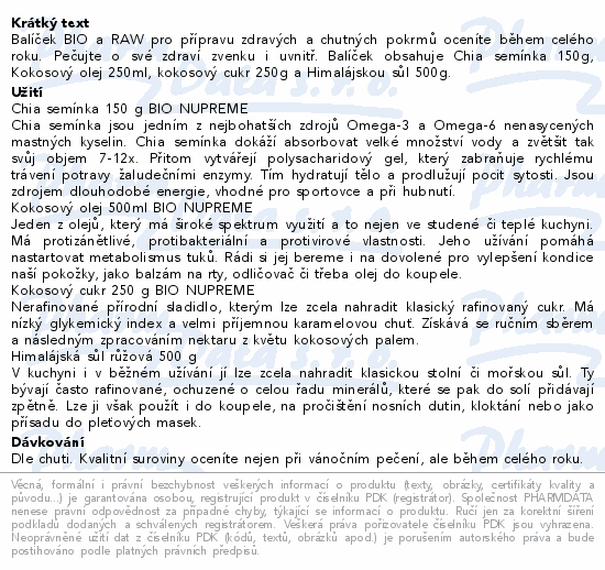 Balíček BIO a RAW pro přípravu zdravých a chutných pokrmů oceníte během celého roku. Pečujte o své zdraví zvenku i uvnitř. Balíček obsahuje Chia semínka 150g, Kokosový olej 250ml, kokosový cukr 250g a Himalájskou sůl 500g.