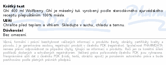 Ghí 400 ml Wolfberry. Ghí je máselný tuk vyrobený podle starodávného ajurvédského receptu přepuštěním 100% másla.