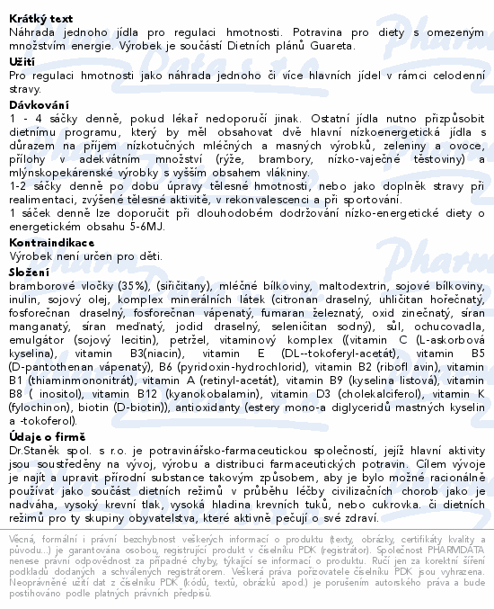 Náhrada jednoho jídla pro regulaci hmotnosti. Potravina pro diety s omezeným množstvím energie. Výrobek je součástí Dietních plánů Guareta.