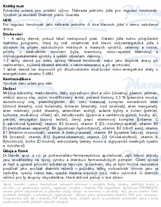 Potravina určená pro zvláštní výživu. Náhrada jednoho jídla pro regulaci hmotnosti. Výrobek je součástí Dietních plánů Guareta.