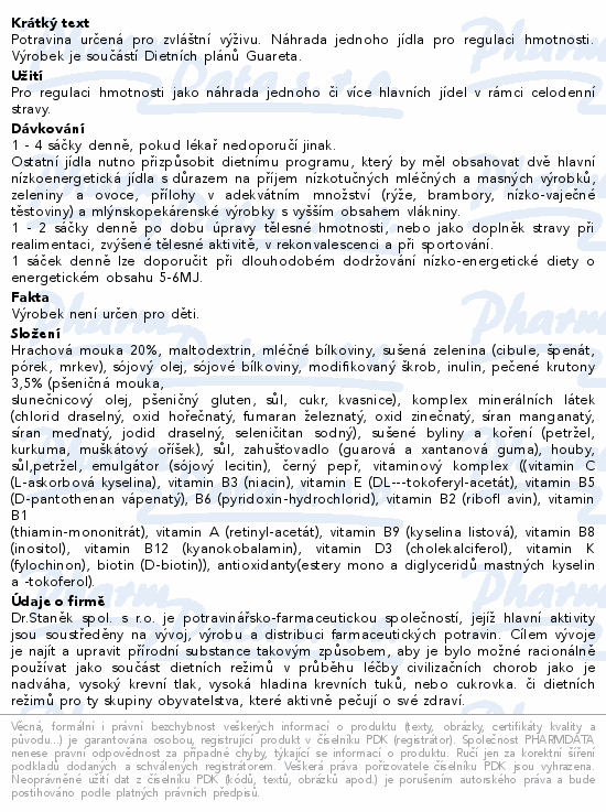 Potravina určená pro zvláštní výživu. Náhrada jednoho jídla pro regulaci hmotnosti. Výrobek je součástí Dietních plánů Guareta.