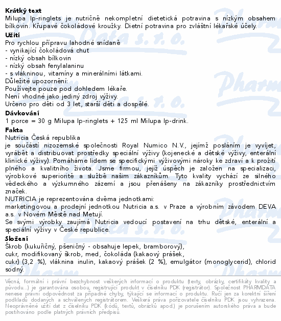 Milupa lp-ringlets je nutričně nekompletní dietetická potravina s nízkým obsahem bílkovin. Křupavé čokoládové kroužky. Dietní potravina pro zvláštní lékařské účely.
