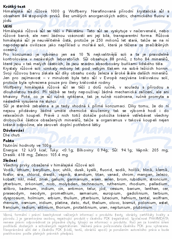 Himalájská sůl růžová 1000 g Wolfberry. Nerafinovaná přírodní krystalická sůl s obsahem 84 stopových prvků. Bez umělých anorganických aditiv, chemického fluoru a jódu.
