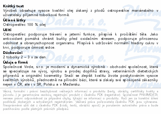 Výrobek obsahuje vysoce kvalitní olej získaný z plodů ostropestřce mariánského v uživatelsky příjemné tobolkové formě.