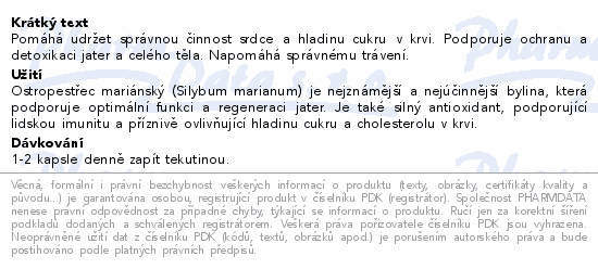 Pomáhá udržet správnou činnost srdce a hladinu cukru v krvi. Podporuje ochranu a detoxikaci jater a celého těla. Napomáhá správnému trávení.