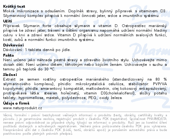 Mokrá mikronizace s odsušením. Doplněk stravy, bylinný přípravek s vitaminem D3. Silymarinový komplex přispívá k normální činnosti jater, srdce a imunitního systému.