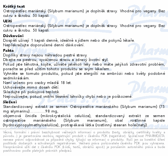 Ostropestřec mariánský (Silybum marianum) je doplněk stravy. Vhodné pro vegany. Bez cukru a škrobu. 50 kapslí.