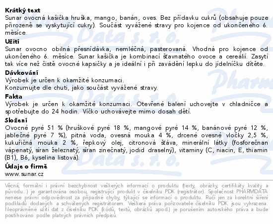 Sunar ovocná kašička hruška, mango, banán, oves. Bez přídavku cukrů (obsahuje pouze přirozeně se vyskytující cukry). Součást vyvážené stravy pro kojence od ukončeného 6. měsíce.