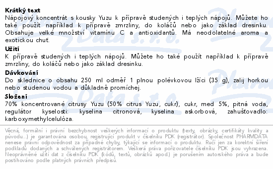 Nápojový koncentrát s kousky Yuzu k přípravě studených i teplých nápojů. Můžete ho také použít například k přípravě zmrzliny, do koláčů nebo jako základ dresinku. Obsahuje velké množství vitamínu C a antioxidantů. Má neodolatelné aroma a exotickou chuť.
