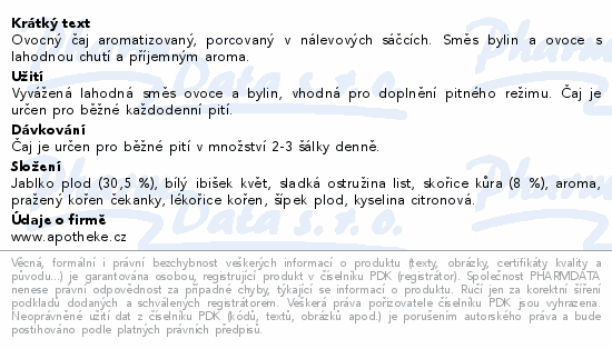 Ovocný čaj aromatizovaný, porcovaný v nálevových sáčcích. Směs bylin a ovoce s lahodnou chutí a příjemným aroma.