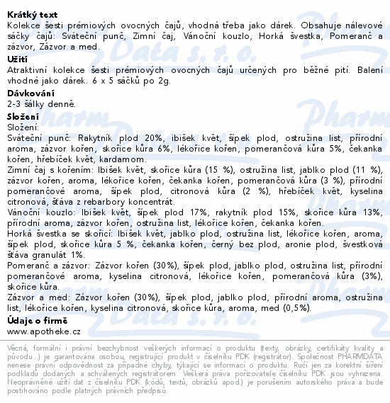 Kolekce šesti prémiových ovocných čajů, vhodná třeba jako dárek. Obsahuje nálevové sáčky čajů: Sváteční punč, Zimní čaj, Vánoční kouzlo, Horká švestka, Pomeranč a zázvor, Zázvor a med.